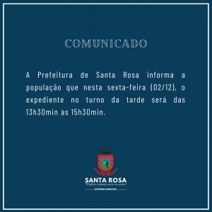 A Prefeitura de Santa Rosa informa a população que na sexta-feira, dia 02/12, o expediente do turno da tarde será...