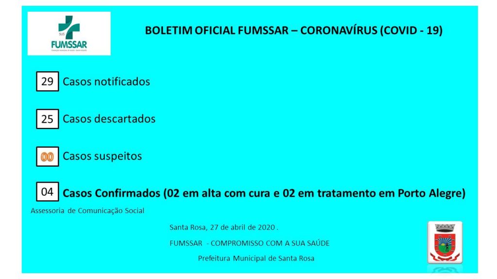 Boletim - NOVO Coronavírus (COVID-19) Atualizado 27 de abril de 2020 0 Continue Reading Previous Boletim atualizado Coronavírus em Santa RosaNext BOLETIM CORONAVÍRUS -29/4/2020 Deixe um comentário Cancelar respostaO seu endereço de e-mail não será publicado. Campos obrigatórios são marcados com *Comentário * Nome * E-mail * Site