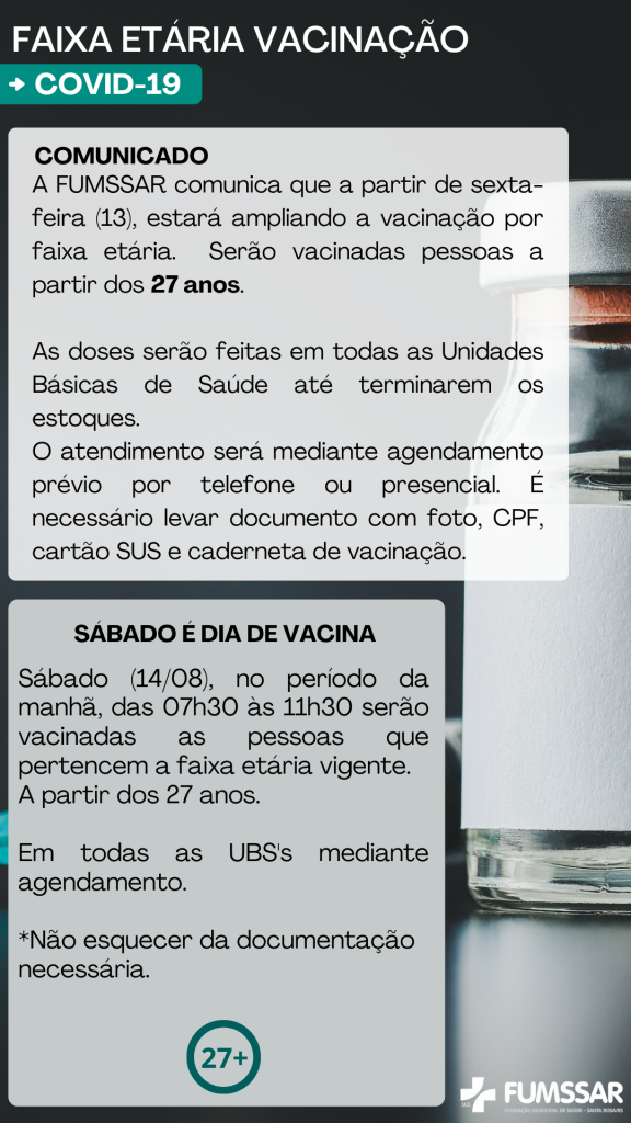 COVID-19 Notícias Pessoas a partir dos 27 anos já podem se vacinar contra a COVID-19 13 de agosto de 2021 Continue Reading Previous BOLETIM COVID-19Next Vacinômetro COVID-19