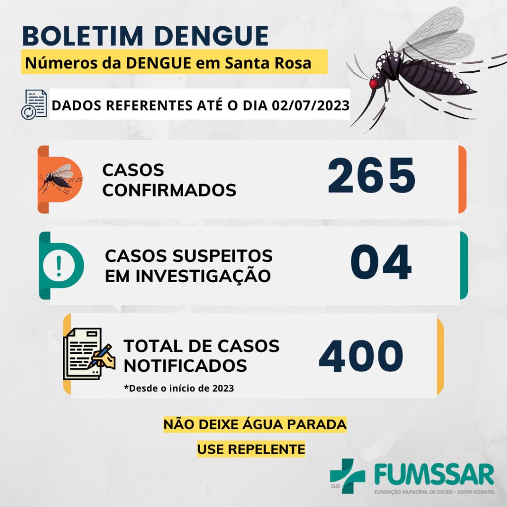 Notícias Boletim Dengue 3 de julho de 2023 Continue Reading Previous Atendimento Digital: FUMSSAR entrega notebooks e TVs para as equipes das Unidades Básicas de Saúde e dos CAPSNext Boletim COVID-19