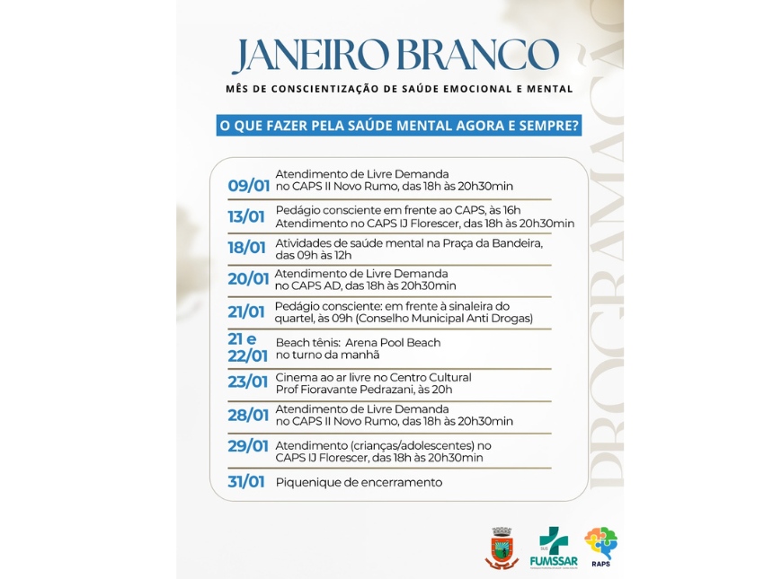 A FUMSSAR conta com equipes multiprofissionais qualificadas, compostas por médicos psiquiatras, neurologistas e clínicos gerais, além de psicólogas, terapeutas ocupacionais, assistentes sociais, enfermeiras, oficineiras, educadores físicos e técnicos de enfermagem. A programação do Janeiro Branco é voltada principalmente para as pessoas com transtornos mentais e/ou sofrimento psíquico, que estão em tratamento na rede pública de saúde de Santa Rosa. Dentre as ações propostas, estão práticas esportivas, cinema ao ar livre e atendimento psicossocial em demanda livre. A primeira atividade começa na quinta-feira (09), com atendimento em livre demanda no CAPS II Novo Rumo, das 18h às 20h30min. A programação completa pode ser conferida nas páginas oficiais da prefeitura.