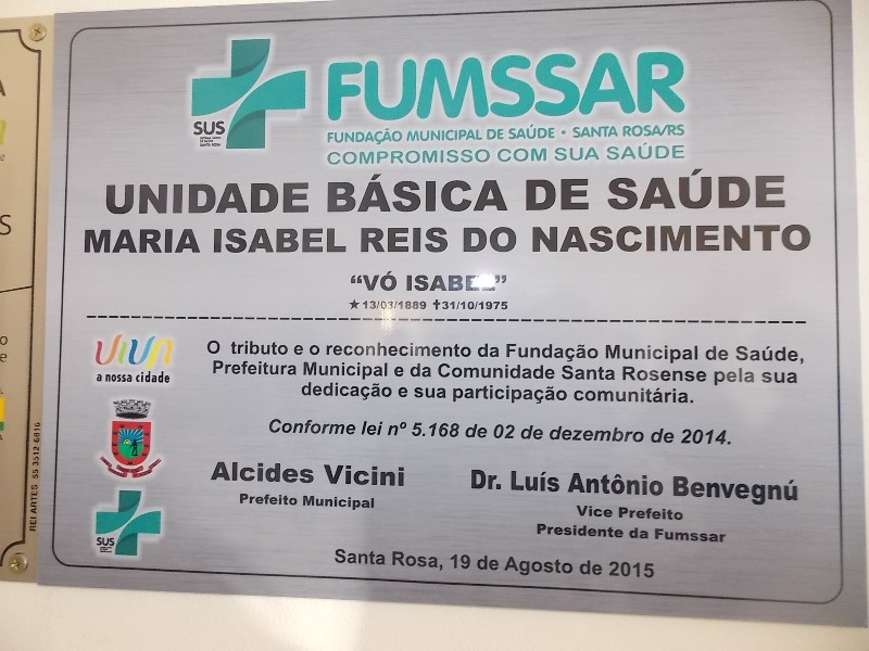 Maria Isabel Reis do Nascimento “ Vó Isabel”, é o nome oficial da unidade básica de saúde Esperança do bairro São Francisco. A solenidade oficial foi realizada na manhã de quarta-feira,19, nas dependências da unidade momento em que foi descerrada a placa de denominação. A homenagem foi aprovada pela Câmara de Vereadores, através de proposição do vereador Valdemar Fonseca, e sancionada pelo executivo através da lei 5.168 de 2 de dezembro de 2014.