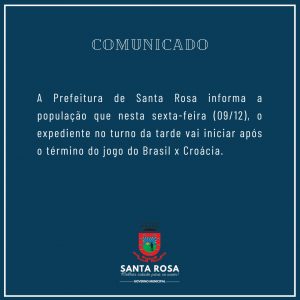 A Prefeitura de Santa Rosa informa a população que na sexta-feira, dia 09/12, o expediente do turno da tarde vai...