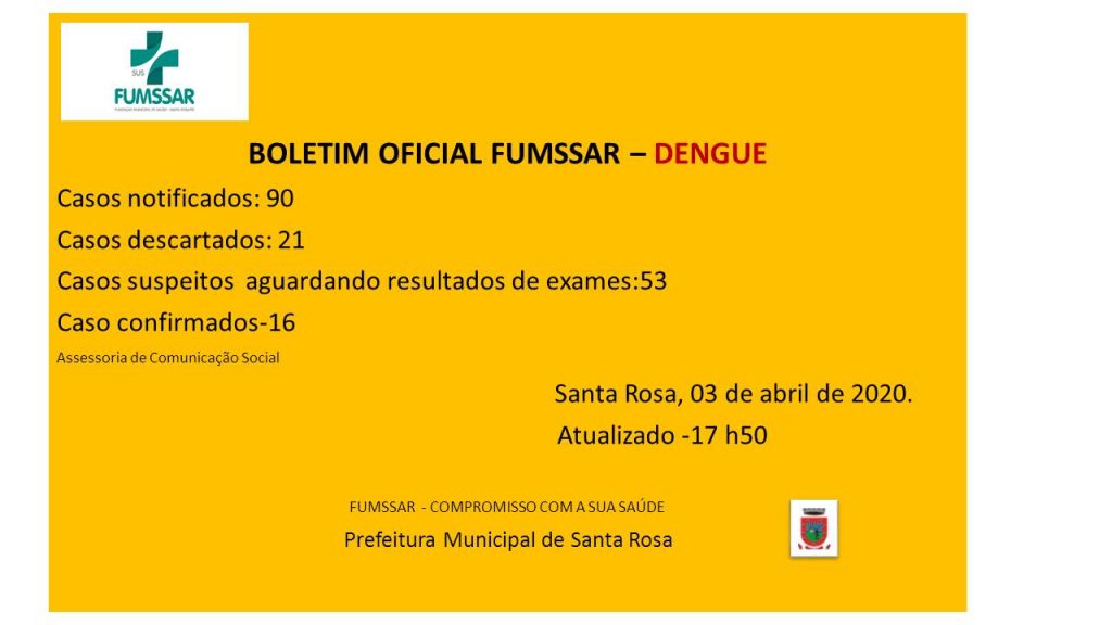 Notícias BOLETIM DENGUE ATUALIZADO EM 3/4/2020 3 de abril de 2020 0 Continue Reading Previous BOLETIM DE CASOS DE CORONAVÍRUS ATUALIZADO EM 01/04/2020Next BOLETIM ATUALIZADO DE CASOS DE DENGUE EM SANTA ROSA. Deixe um comentário Cancelar respostaO seu endereço de e-mail não será publicado. Campos obrigatórios são marcados com *Comentário * Nome * E-mail * Site