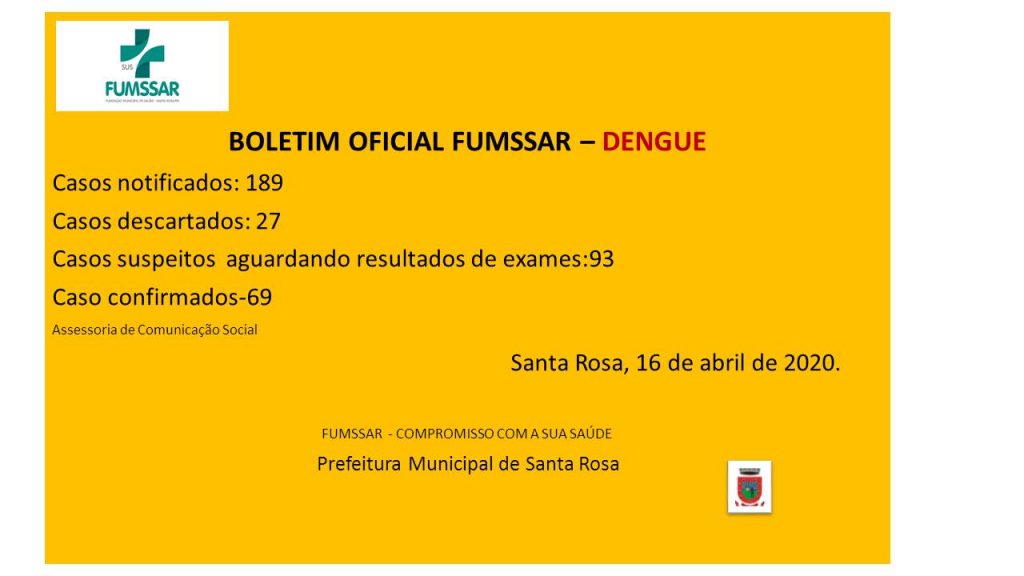 Notícias BOLETIM DE CASOS DE DENGUE 16 de abril de 2020 0 Atualização em 16/04/2020 Continue Reading Previous Santa Rosa inicia a segunda etapa de vacinação contra a gripe H1N1Next EXCLUSIVO PARA OS SERVIDORES DA FUMSSAR Deixe um comentário Cancelar respostaO seu endereço de e-mail não será publicado. Campos obrigatórios são marcados com *Comentário * Nome * E-mail * Site