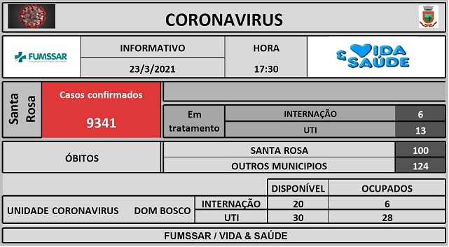 Boletim - NOVO Coronavírus (COVID-19) Notícias BOLETIM COVID 23 de março de 2021 Continue Reading Previous Edital 04 – CLASSIFICAÇÃO FINAL E HOMOLOGAÇÃO DO PROCESSO SELETIVO 02/2021Next BOLETIM COVID