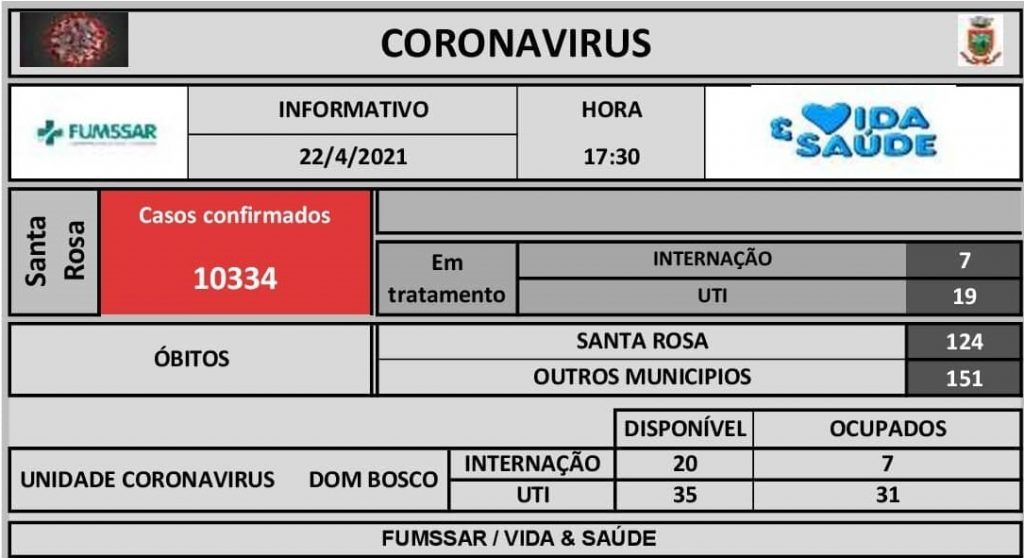 Boletim - NOVO Coronavírus (COVID-19) Notícias BOLETIM COVID 22 de abril de 2021 Continue Reading Previous Vacinômetro Covid-19Next NOTA OFICIAL