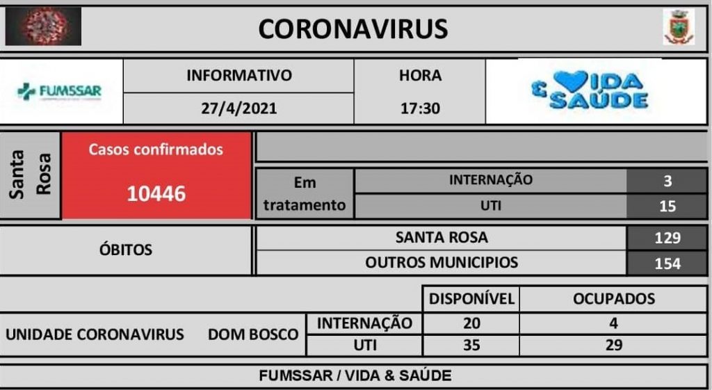 Boletim - NOVO Coronavírus (COVID-19) Notícias BOLETIM COVID 27 de abril de 2021 Continue Reading Previous FUMSSAR realiza ações de prevenção e combate à DengueNext Vacinômetro Covid-19