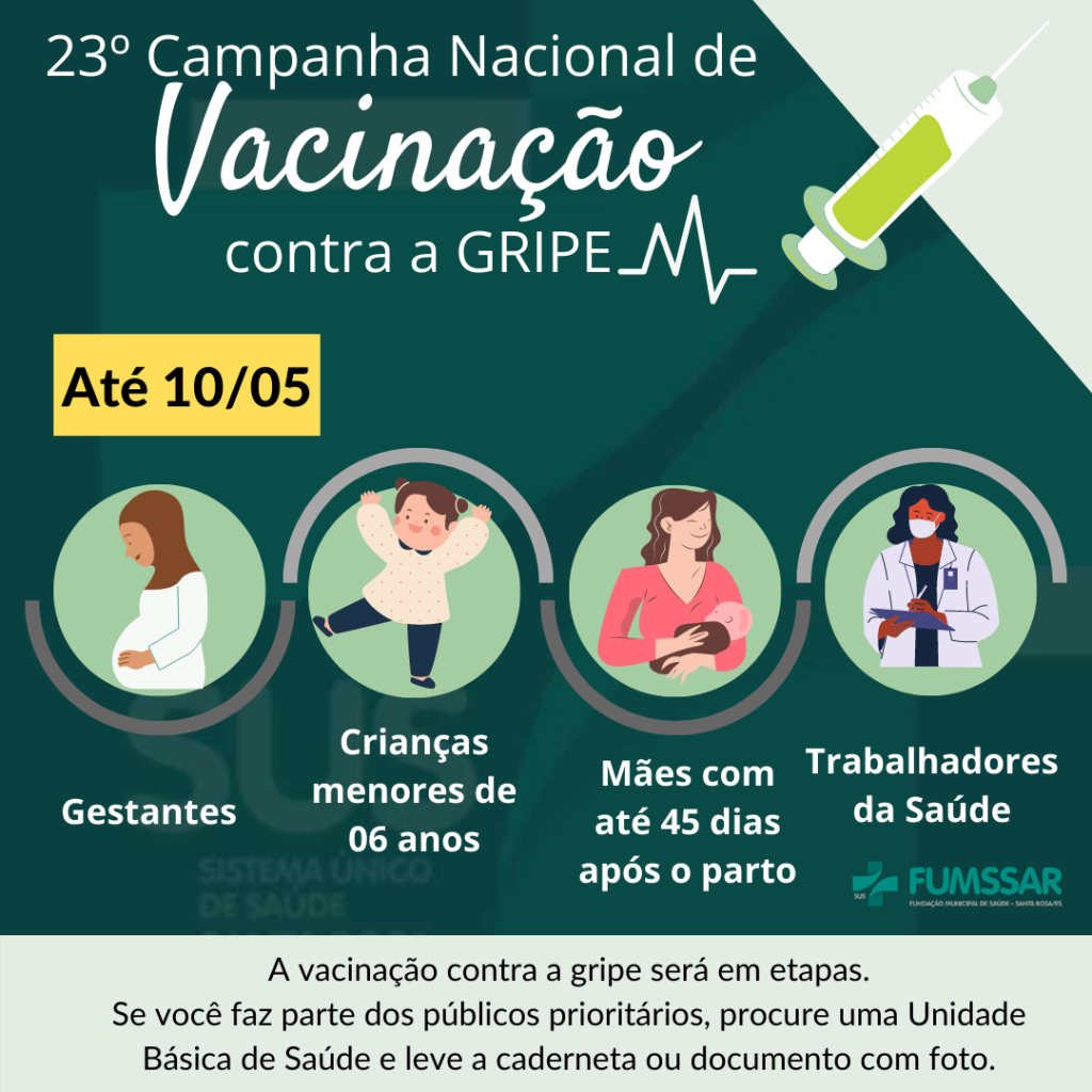 Vacinação contra a Influenza (Gripe). A campanha será dividida em etapas e por grupos prioritários, e contemplará, na primeira fase, que ocorre até 10 de maio, as crianças de 6 meses a menores de 6 anos de idade (5 anos, 11 meses e 29 dias), gestantes, puérperas e trabalhadores da saúde.