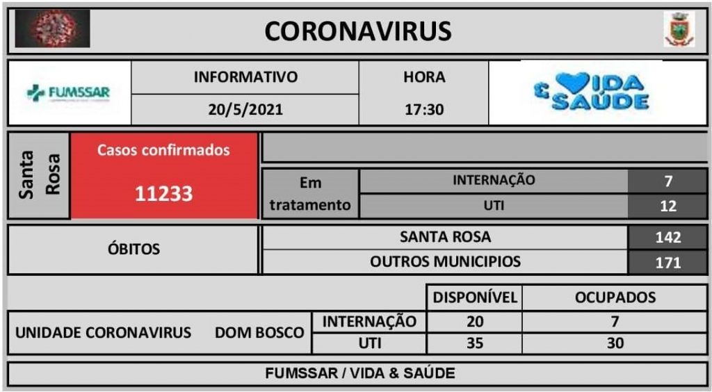 Boletim - NOVO Coronavírus (COVID-19) COVID-19 Notícias BOLETIM COVID-19 20 de maio de 2021 Continue Reading Previous Santa Rosa aplicou mais de 25.000 doses da vacina contra a COVID-19Next BOLETIM COVID-19