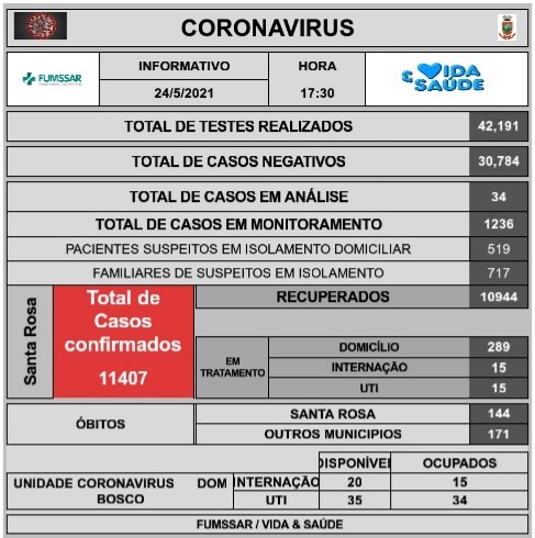Boletim - NOVO Coronavírus (COVID-19) COVID-19 Notícias BOLETIM COVID-19 24 de maio de 2021 Continue Reading Previous 24/05/2021 – Decretos municipais emitidos a partir de definições ocorridas em reunião dos prefeitos da AMUFRONNext FUMSSAR recebe doses da Pfizer