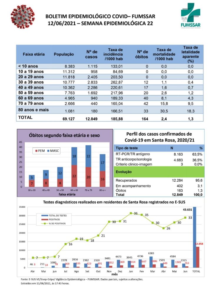 Boletim - NOVO Coronavírus (COVID-19) Notícias Boletim Epidemiológico Covid-Fumssar 12 de junho de 2021 Continue Reading Previous BOLETIM COVID-19Next VACINAÇÃO COVID-19 – NOVA FAIXA ETÁRIA