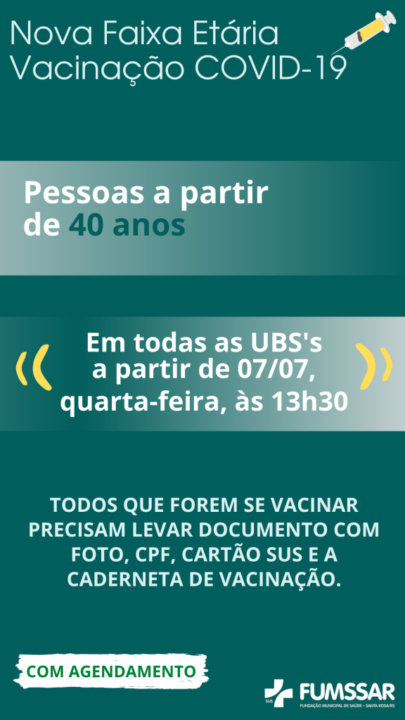 COVID-19 Notícias Vacinação contra COVID-19 inicia hoje para pessoas a partir dos 40 anos 7 de julho de 2021 Continue Reading Previous BOLETIM COVID-19Next Protocolos de prevenção são intensificados na UBS Balneária