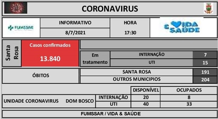 Boletim - NOVO Coronavírus (COVID-19) COVID-19 Notícias BOLETIM COVID-19 8 de julho de 2021 Continue Reading Previous Vacinômetro – COVID-19Next Secretários de Saúde da 14ª Coordenadoria Regional de Saúde se reúnem na FUMSSAR