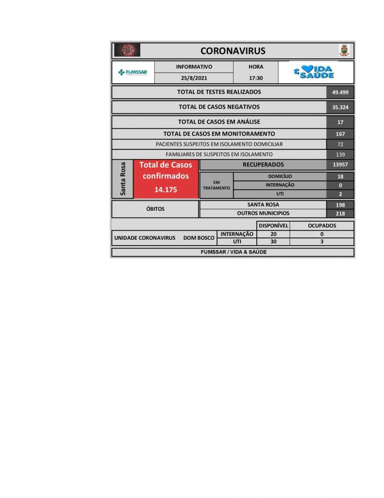 Boletim - NOVO Coronavírus (COVID-19) Notícias Boletim Covid-19 25 de agosto de 2021 Continue Reading Previous Vacinação contra a COVID-19 avança para pessoas a partir dos 18 anosNext Boletim Covid-19