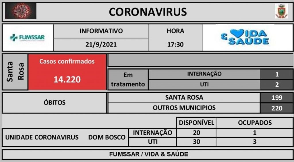 Boletim - NOVO Coronavírus (COVID-19) COVID-19 Notícias BOLETIM COVID-19 21 de setembro de 2021 Continue Reading Previous Santa Rosa vacinou 75% da população contra a COVID-19Next BOLETIM COVID-19