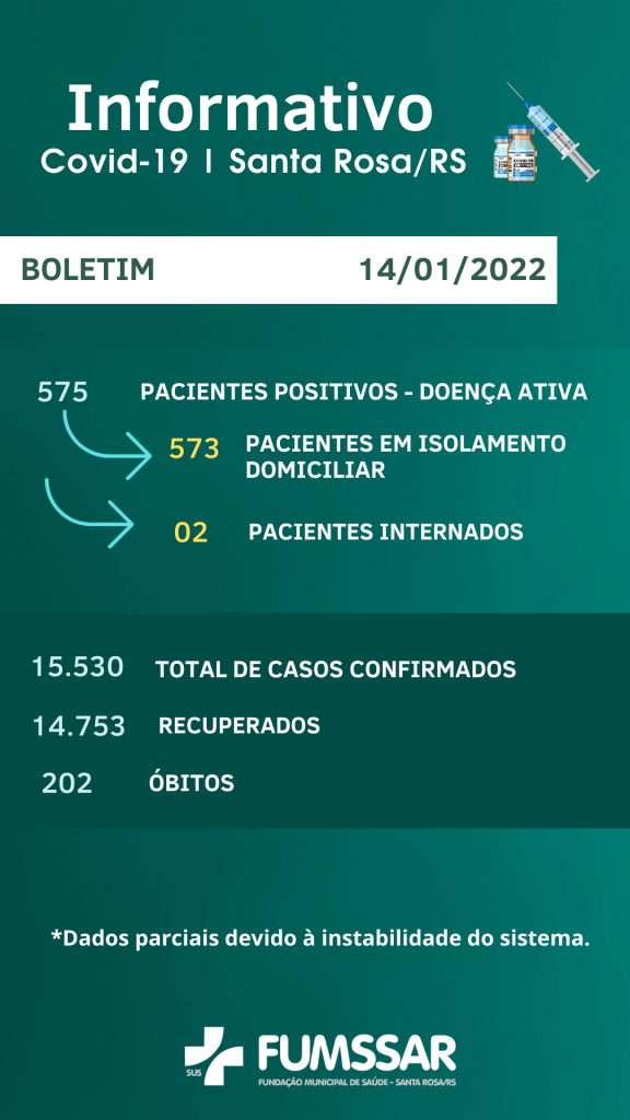 Boletim - NOVO Coronavírus (COVID-19) COVID-19 Notícias BOLETIM COVID-19 14 de janeiro de 2022 Continue Reading Previous Sábado é dia de Mutirão na Central de VacinasNext Informativo
