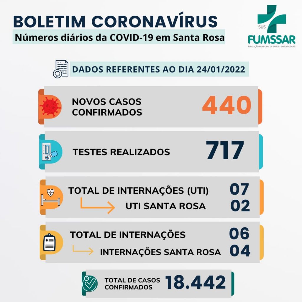 Boletim - NOVO Coronavírus (COVID-19) COVID-19 Notícias Boletim COVID-19 25 de janeiro de 2022 Continue Reading Previous Santa Rosa começa a vacinar crianças de 10 a 11 anos contra a COVID-19Next Vacinação com horário estendido até sexta-feira