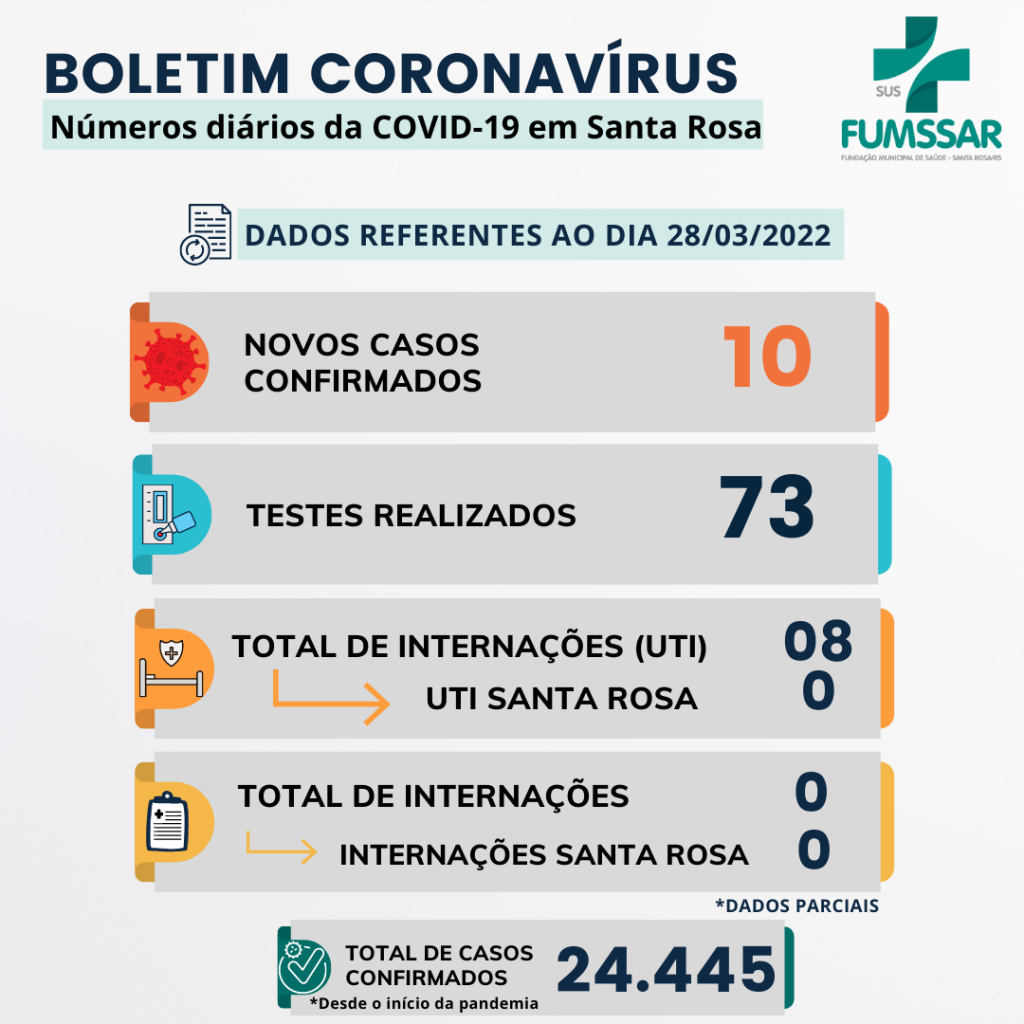 Boletim - NOVO Coronavírus (COVID-19) COVID-19 Notícias Boletim – COVID-19 29 de março de 2022 Continue Reading Previous Equipe da UBS Pereira realiza visita domiciliar para orientação do uso correto de medicamentosNext Certificação Digital é implementada na FUMSSAR