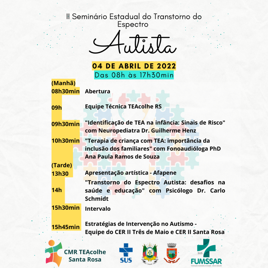 O seminário vai contar com a participação do Deputado Estadual, Eduardo Loureiro, propositor da Lei 15.322/2019 que oportunizou um programa de atendimento integrado aos autistas do Rio Grande do Sul. Durante a programação, serão tratados diversos temas com referência ao autismo. O neuropediatra Dr. Guilherme Henz, vai falar sobre, “Identificação de TEA na infância: Sinais de Risco”, a fonoaudióloga Ana Paula Ramos de Souza irá apresentar o tema, “Terapia de criança com TEA: importância da inclusão dos familiares” e o Psicólogo Dr. Carlo Schmidt, vai falar sobre, “Transtorno do Espectro Autista: desafios na saúde e educação”. Além disso, as equipes do CER II Três de Maio e do CER II Santa Rosa vão abordar sobre: Estratégias de Intervenção no Autismo.