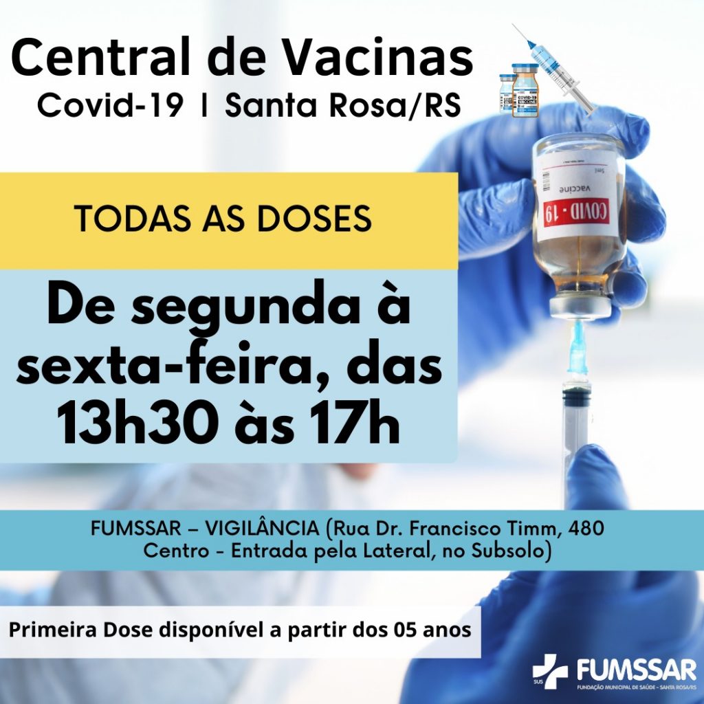 A FUMSSAR informa que a partir da terça-feira (03), a vacinação contra a COVID-19 na Central de Vacinas vai acontecer somente no turno da tarde. O atendimento será das 13h30min às 17h, de segunda a sexta-feira.