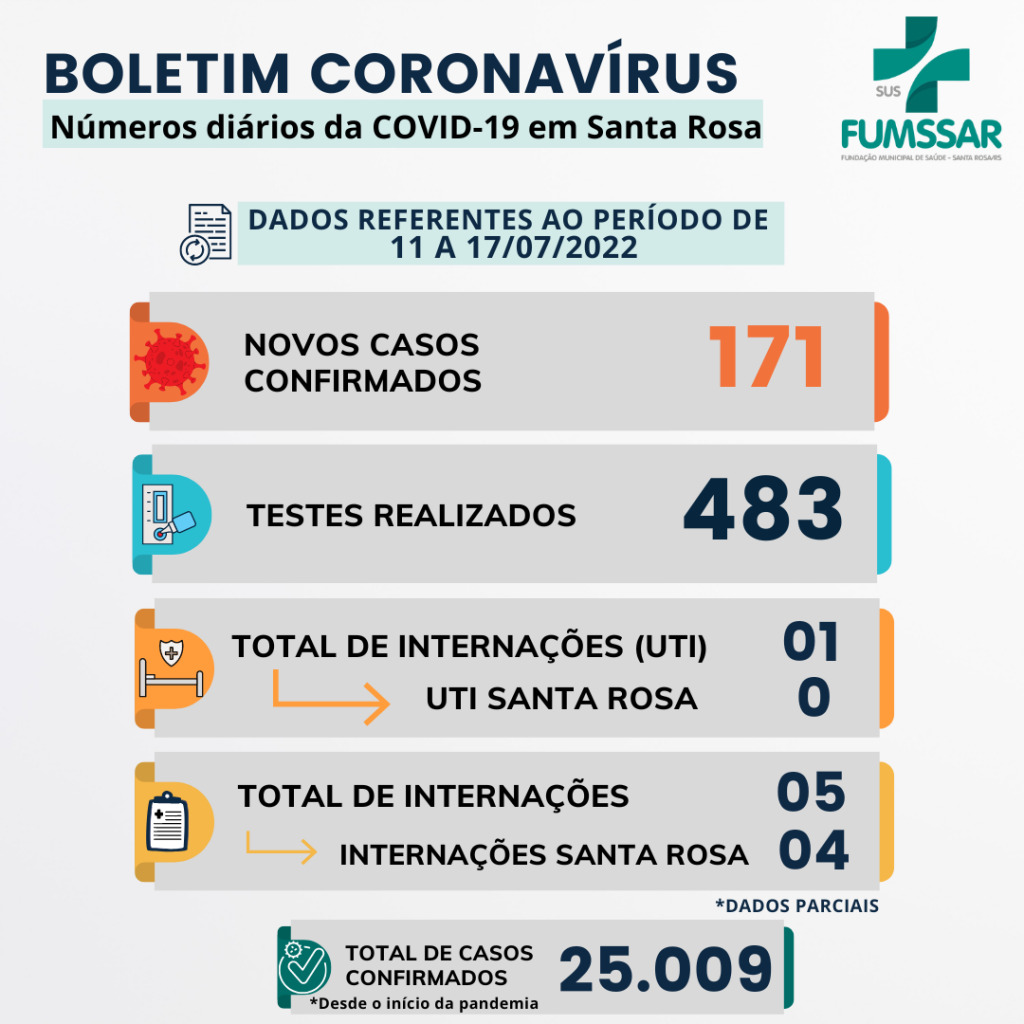 Boletim - NOVO Coronavírus (COVID-19) COVID-19 Notícias Boletim – COVID-19 18 de julho de 2022 Continue Reading Previous Presidente da FUMSSAR participa de congresso nacional sobre Saúde PúblicaNext Ações de prevenção e saúde são realizadas com alunos de Santa Rosa