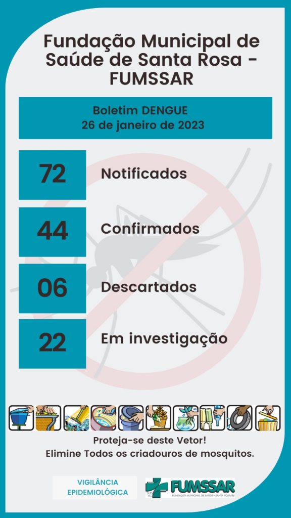 Notícias Boletim Dengue 29 de janeiro de 2024 Continue Reading Previous Retrospectiva Unidades Básicas de Saúde: Jardim PetrópolisNext Santa Rosa tem 44 casos de Dengue confirmados