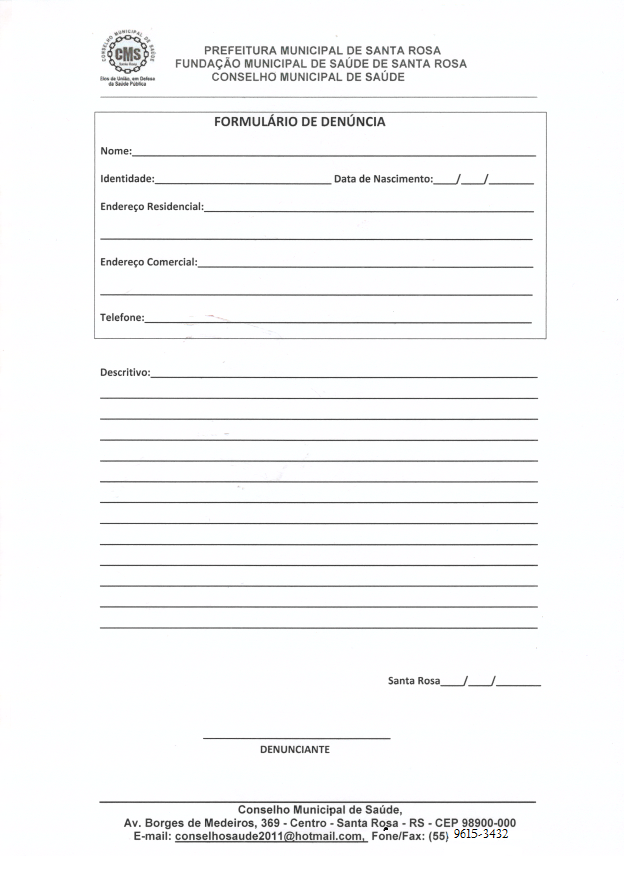 Conselho Municipal de Saúde > Resoluções Formulário de Denúncia CMS 3 de novembro de 2014 0 CLIQUE AQUI Continue Reading Previous Ata 09/2014 Discussão e aprovação das alterações do Regimento Interno do CMSNext Edital de Convocação Reunião do CMS Deixe um comentário Cancelar respostaO seu endereço de e-mail não será publicado. Campos obrigatórios são marcados com *Comentário * Nome * E-mail * Site