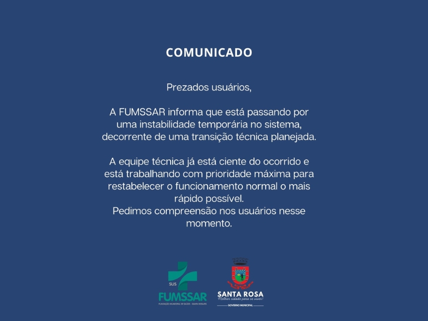 A FUMSSAR informa que está passando por uma instabilidade temporária no sistema, decorrente de uma transição técnica planejada.